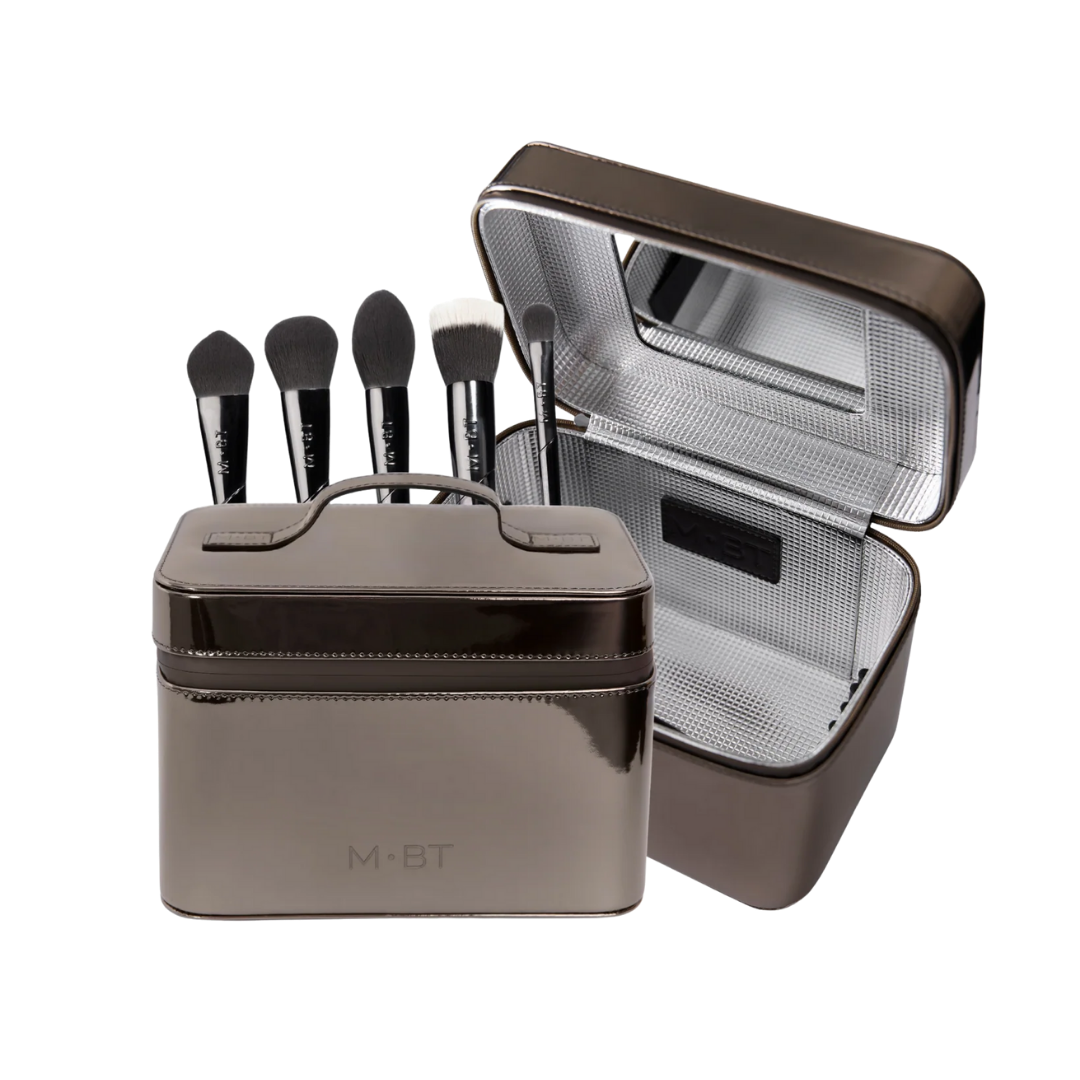 Pilnas penkių veganiškų makiažo teptukų rinkinys su stilingu, talpiu ir kompaktišku M•BT Grožio lagaminėliu. Lagaminėlis pagamintas iš veganiškos odos, su integruotu veidrodėliu, skyreliais kosmetikos organizavimui ir lengvai valomu pamušalu. Pirmąją M•BT makiažo teptukų kolekciją sudaro penki patys būtiniausi teptukai kasdieniam įvaizdžiui kurti.