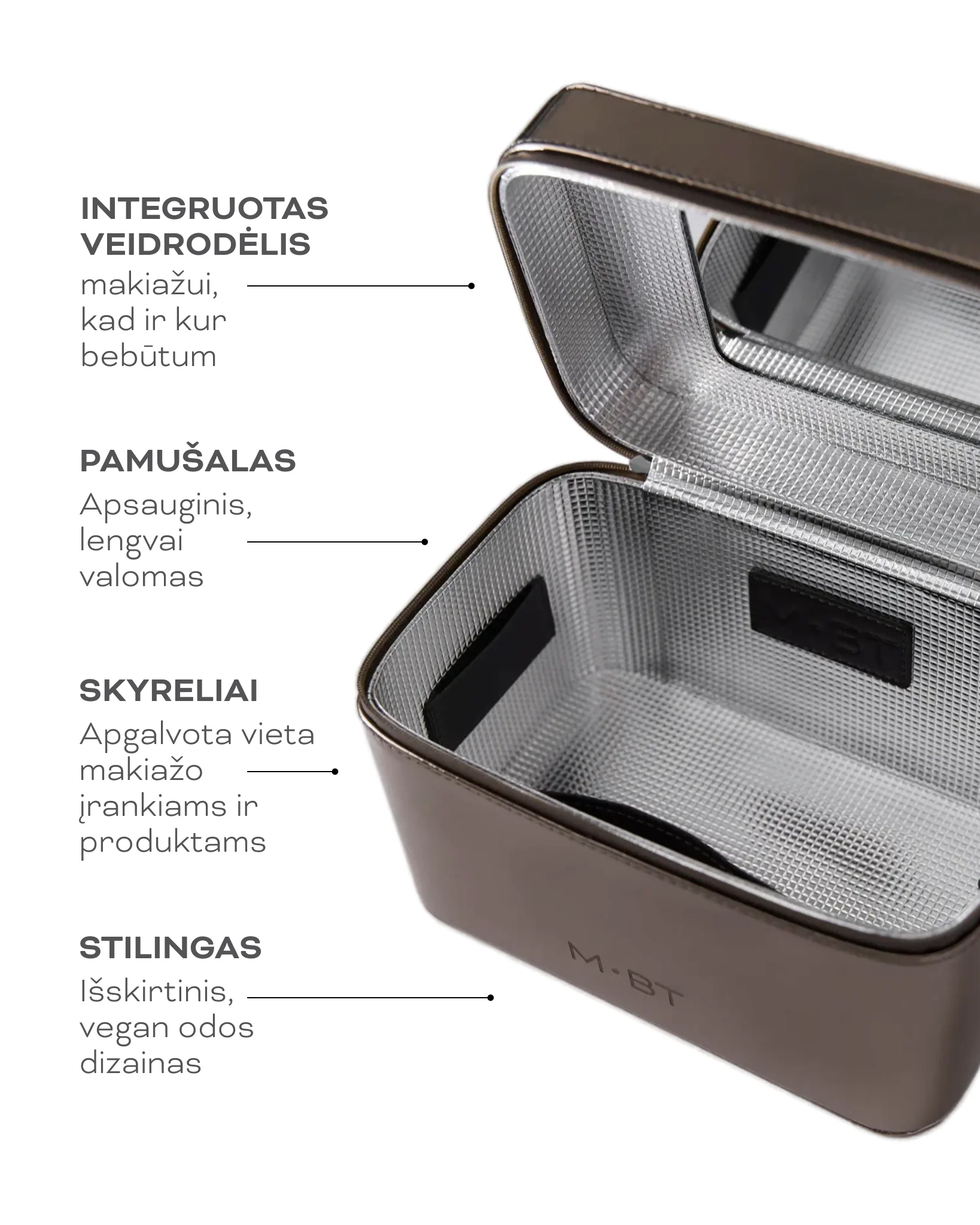 Rinkinys pateikiamas su unikalaus dizaino M•BT Grožio lagaminėliu. Tai daugiau nei kosmetinė. Tai stilingas ir praktiškas aksesuaras kasdieniams grožio ritualams ir kelionėms.