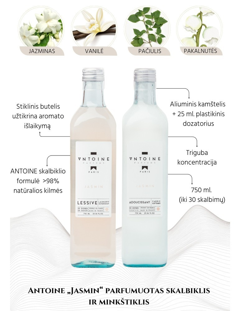Apsirenk savo mėgstamiausiu kvapu. Skalbiklis ir minkštiklis “JASMIN” skirtas estetams, ieškantiems ypatingo dvelksmo savo drabužių spintoje. ANTOINE “Jasmin” kvapas nauju žvilgsniu pažiūri į jazminą – išmyluoja jį su švytinčiu pakalnučių gaivumu, sušildo vanile ir praturtina rafinuotu pačiuliu.