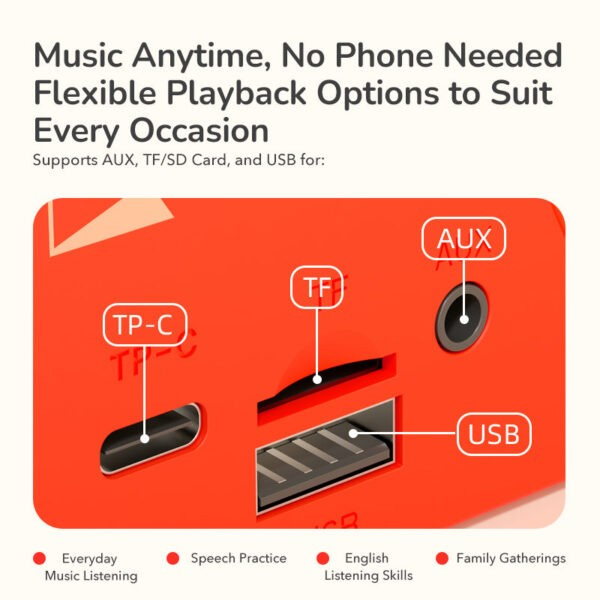 Bevielis ryšys per Bluetooth. Prijunkite rinkinį prie savo išmaniojo telefono, planšetinio kompiuterio ar kitų Bluetooth įrenginių ir pradėkite dainuoti bet kada, bet kur! Tai suteikia neribotas muzikos pasirinkimo galimybes.